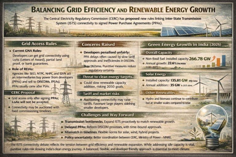 The ISTS connectivity debate reflects the tension between grid efficiency and renewable expansion. While addressing idle capacity is vital, punitive rules risk slowing India’s clean energy journey. A balanced, flexible, and developer-friendly approach is essential to meet climate and energy commitments.