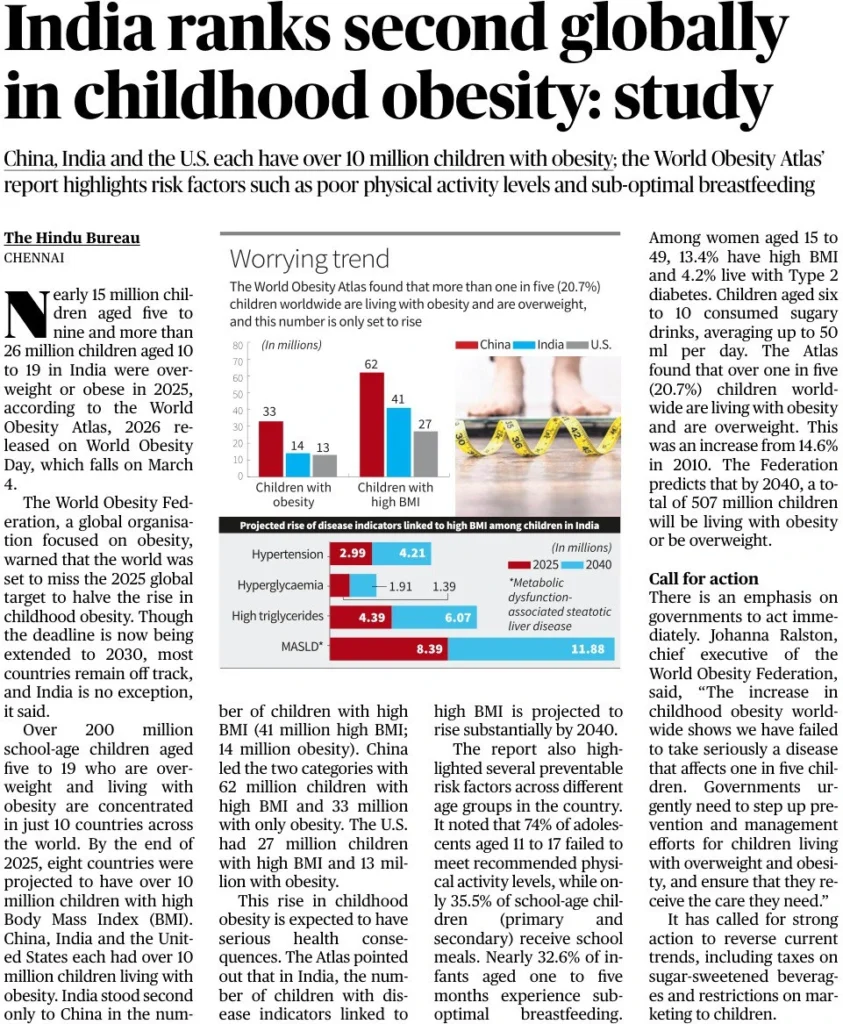 The World Obesity Atlas 2026, released on World Obesity Day (March 4), reported that India has the second highest number of children with obesity, after China — an issue often discussed in UPSC coaching in Hyderabad while analysing public health challenges and demographic trends in India.